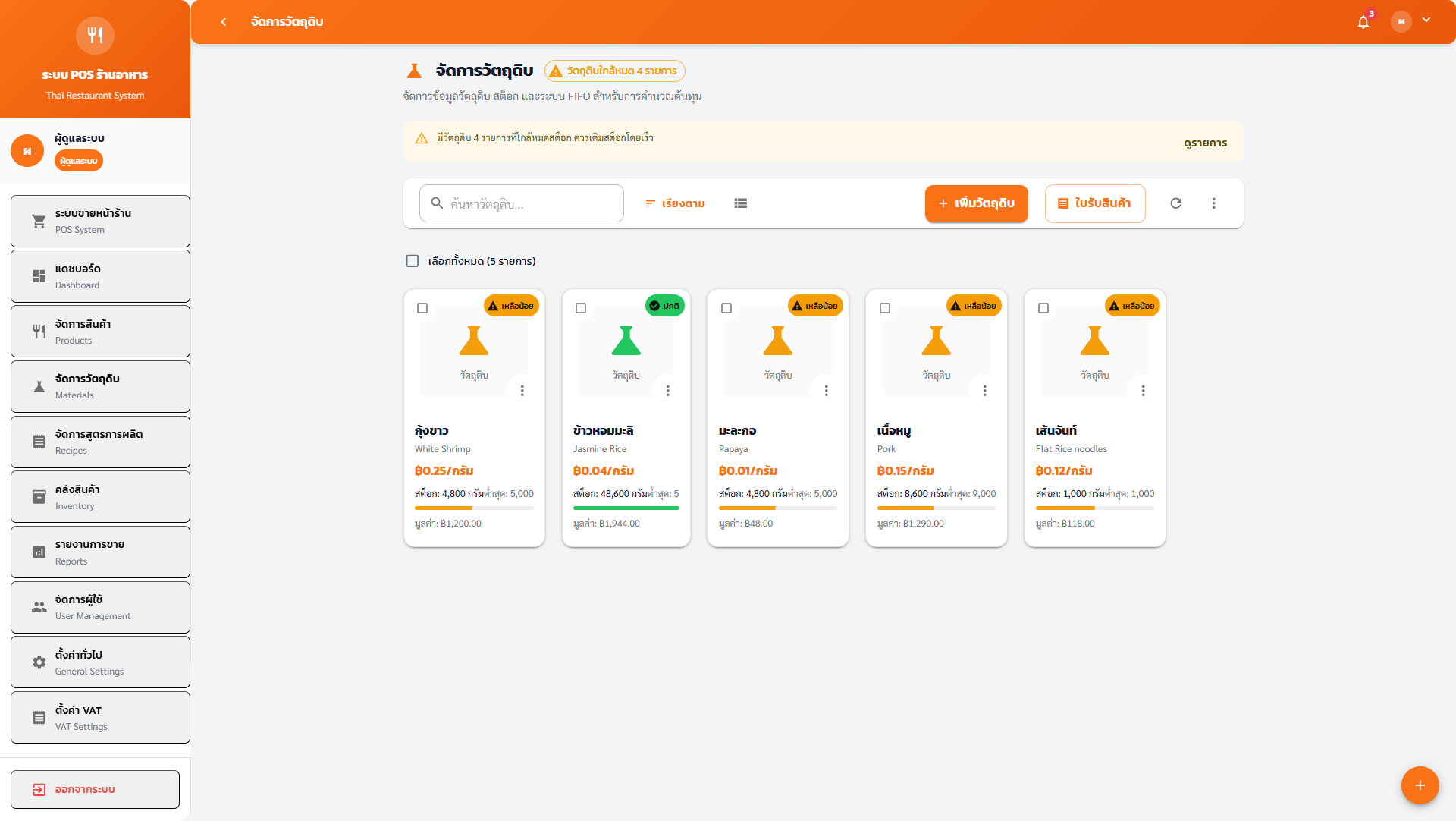 ตรวจสอบวัตถุดิบทุกชนิดด้วยการคำนวณต้นทุนแบบ FIFO ชื่อสองภาษา และประวัติการเคลื่อนไหว พร้อมซิงก์กับสูตรและยอดขาย POS.