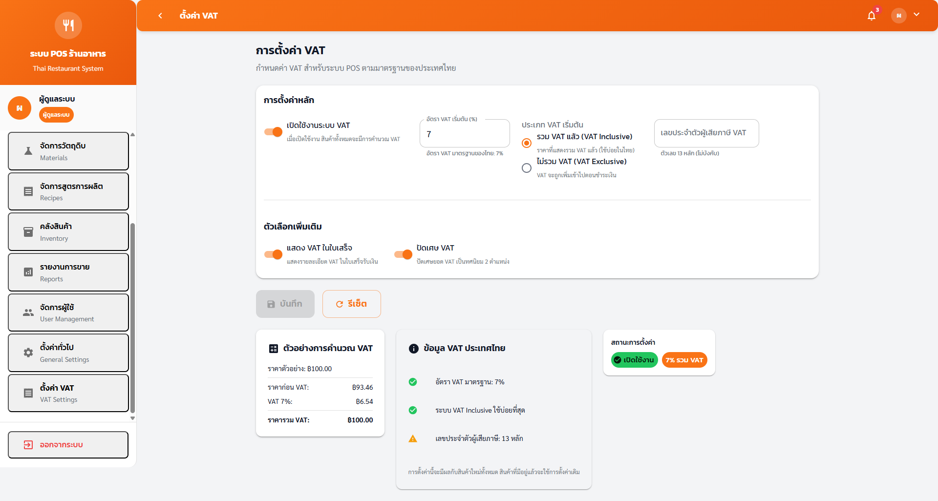 ตั้งค่า VAT 7% ครั้งเดียวแล้วให้ทำงานทั่วทั้งระบบ ไม่ว่าจะเป็น POS ใบเสร็จ หรือรายงาน รองรับราคาทั้งแบบรวมและแยก VAT พร้อมกฎการปัดเศษอัตโนมัติ.