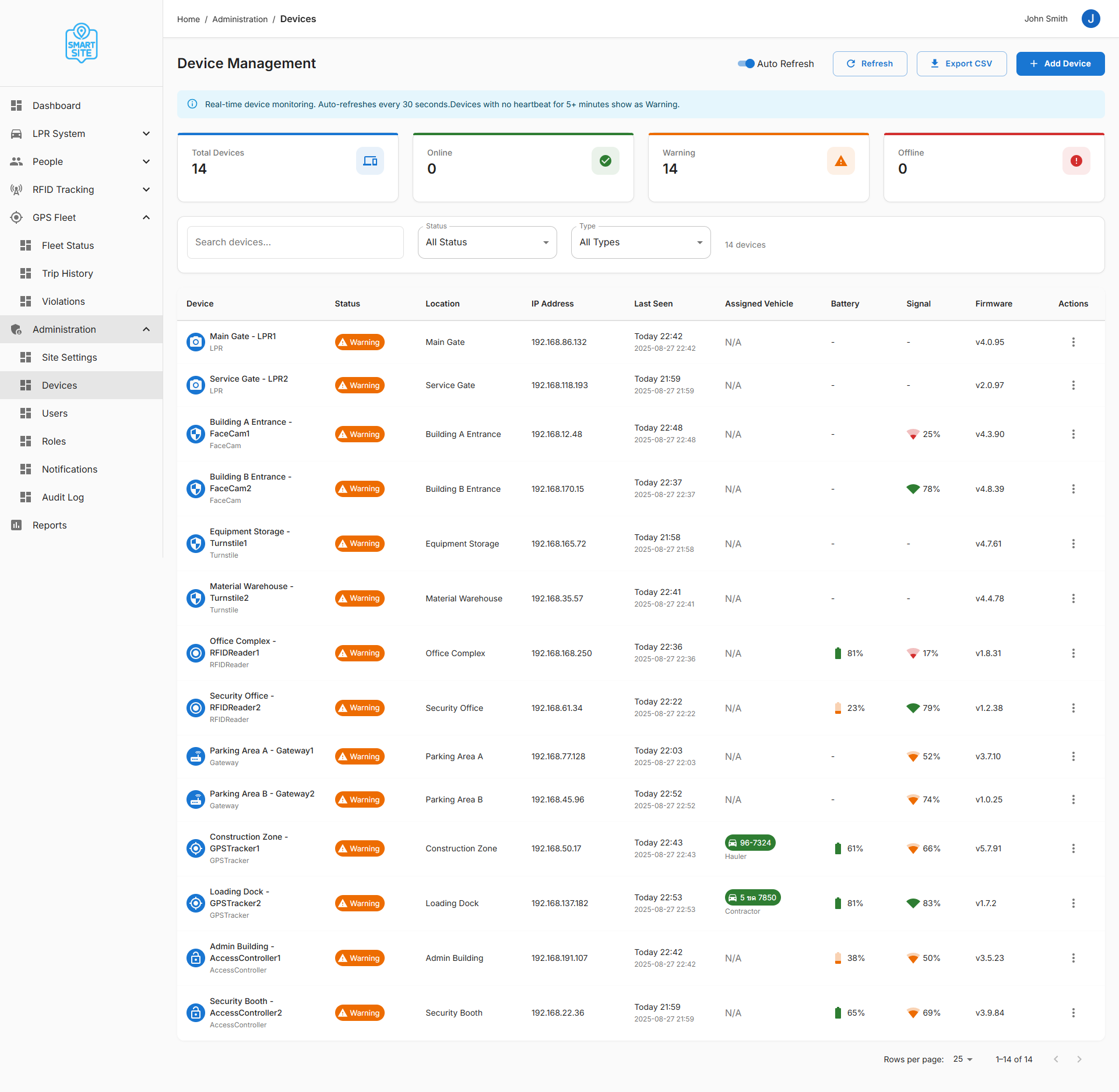 Govern devices, enforce multi-tier RBAC, configure localization, and orchestrate notifications across the entire Smart Site deployment.